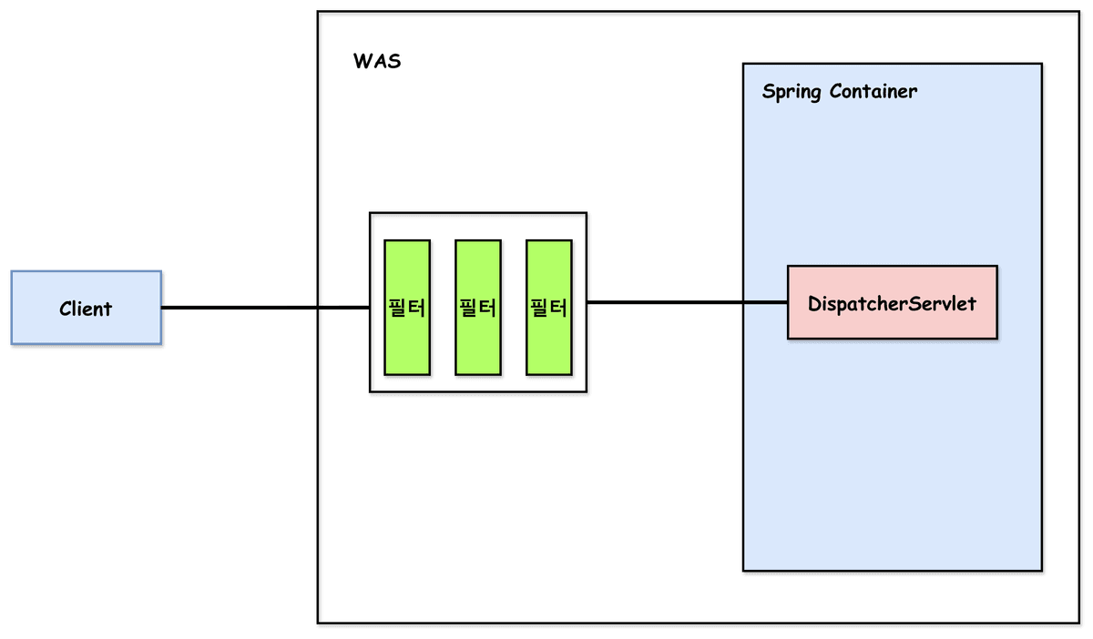 - 클라이언트 요청은 서버 컴퓨터의 WAS(톰캣)의 필터들을 통과한 뒤 스프링 컨테이너의 컨트롤러에 도달한다.
