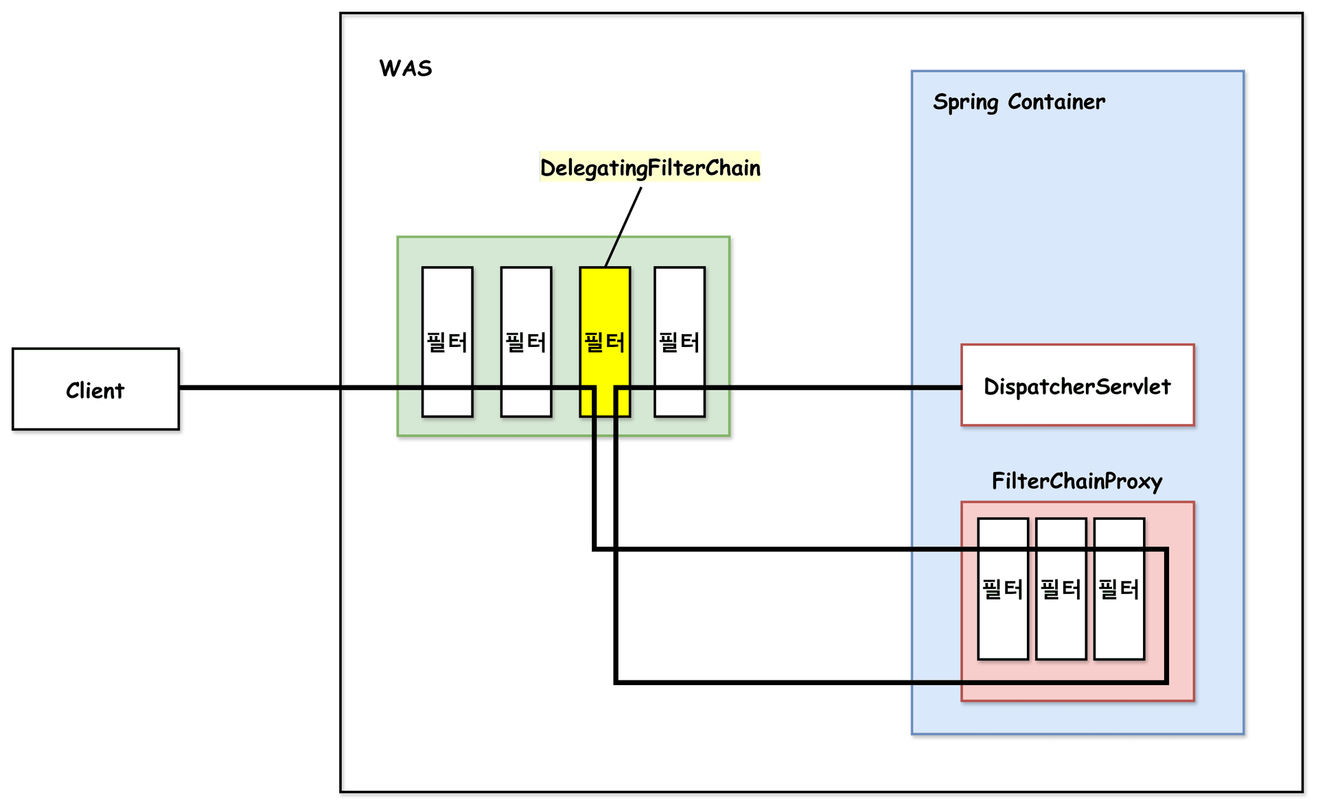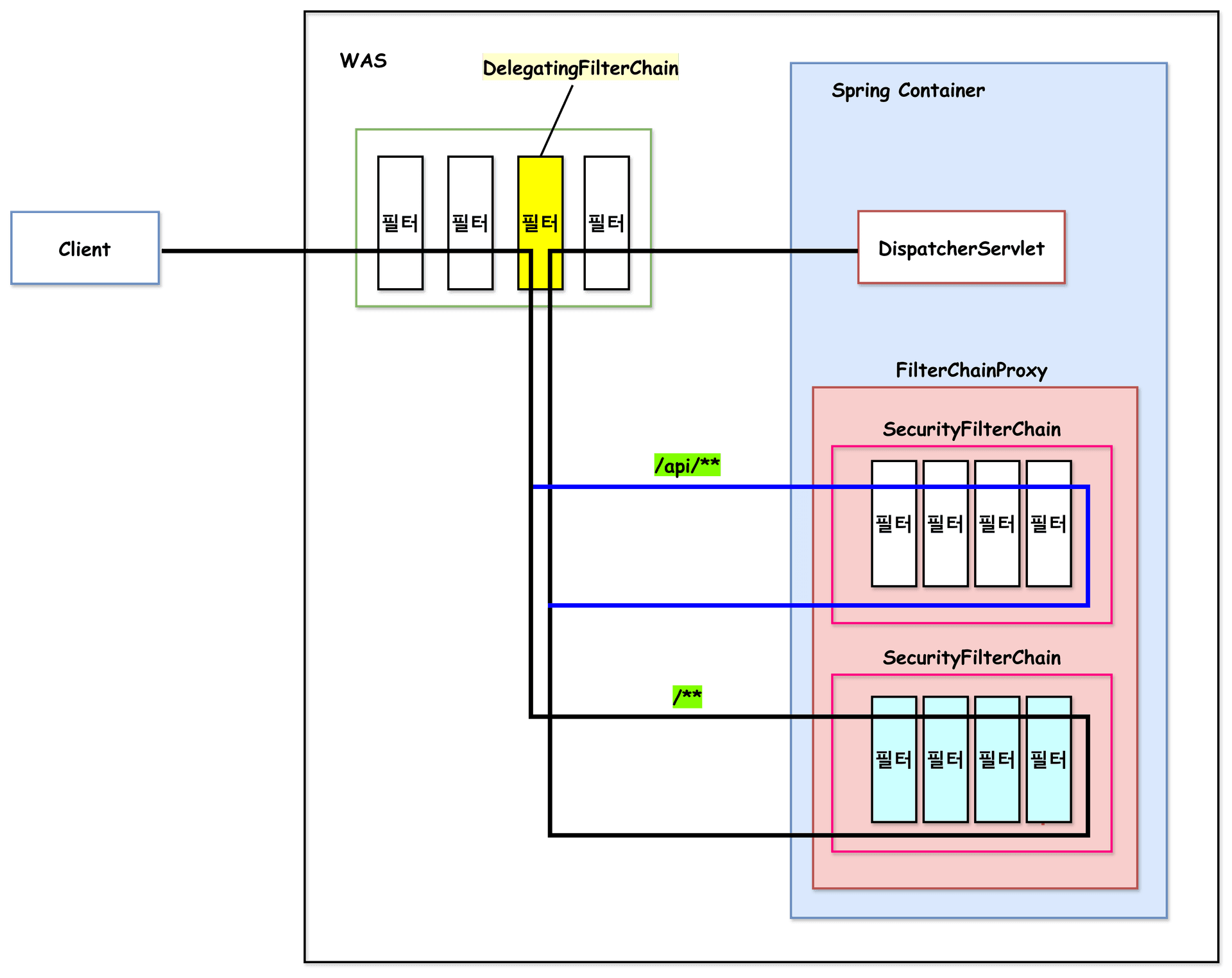 - Spring Security가 WAS의 필터단으로부터 클라이언트 요청을 가로챈 후 FilterChainProxy에게 요청을 전달한다.