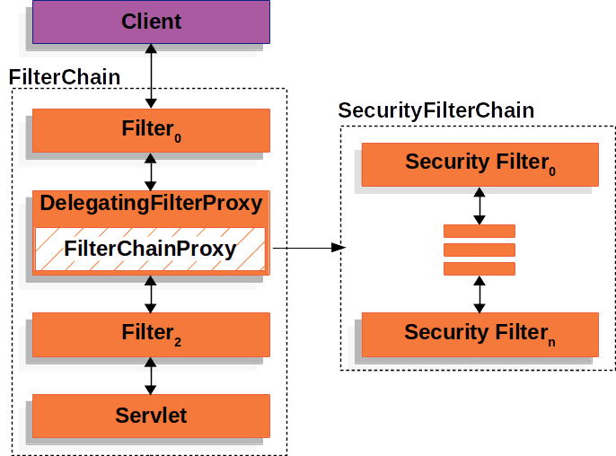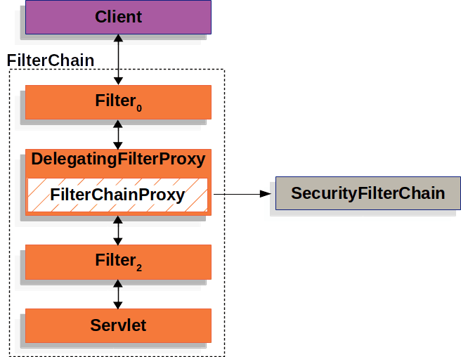 - DelegatingFilterProxy- FilterChainProxy Spring Bean을 찾아 요청을 넘겨주는 서블릿 필터